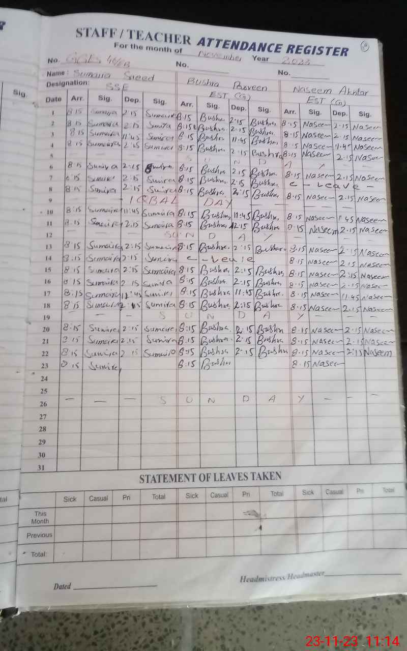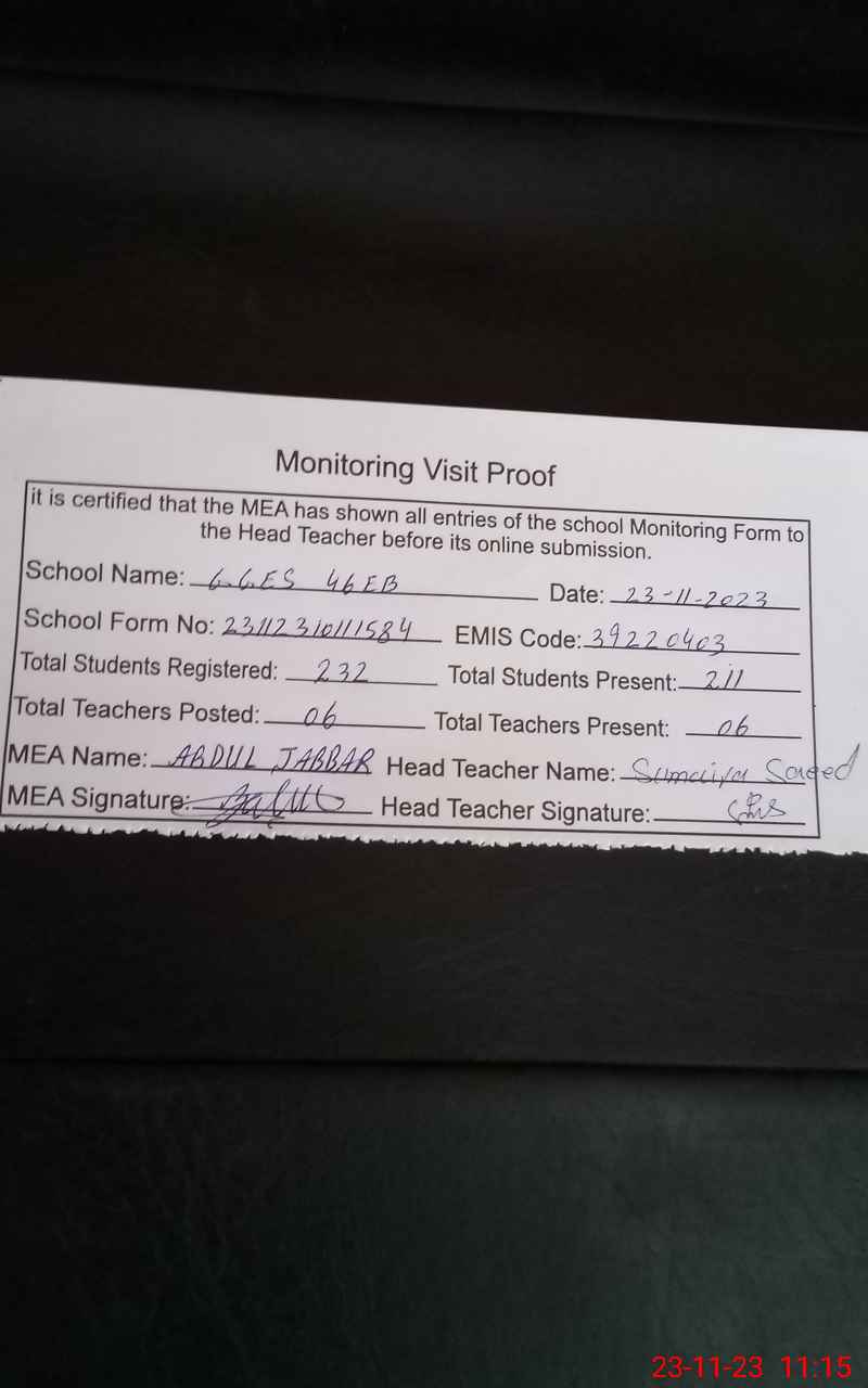 | Attendance Register | Head Teacher | MEA with School | Visit Proof |