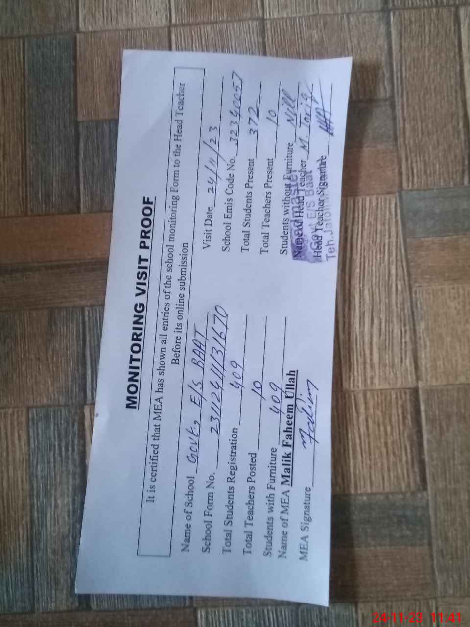 | Attendance Register | Head Teacher | MEA with School | Visit Proof |