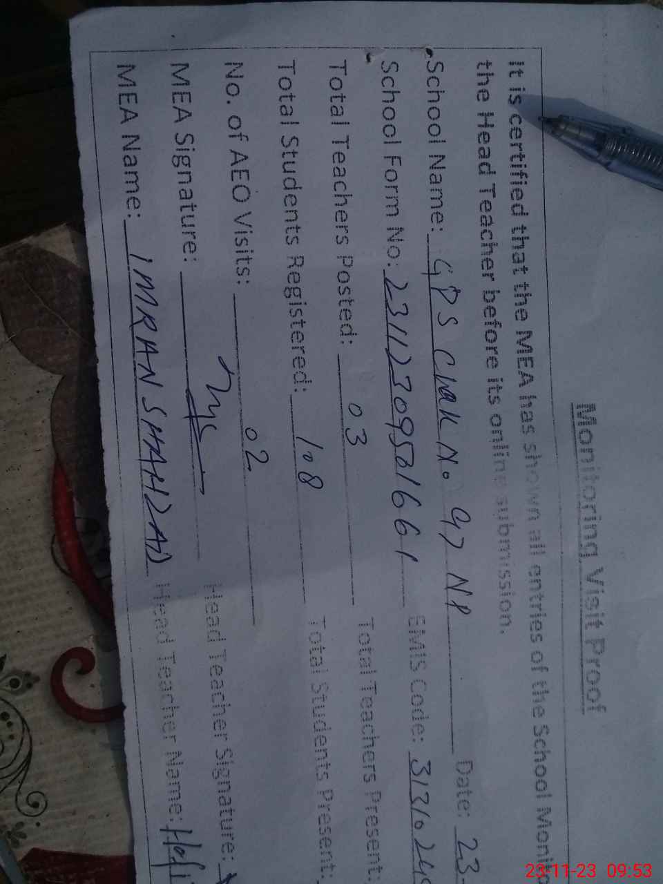 | Attendance Register | Head Teacher | MEA with School | Visit Proof |