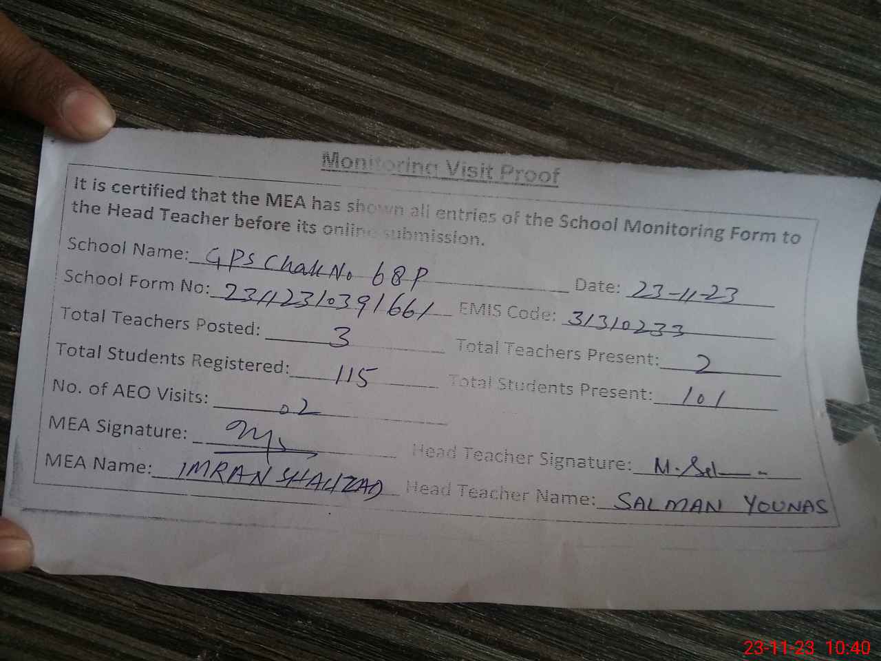 | EMIS Code: 31310233 | Name of School: GPS CHAK NO 68 P | |||