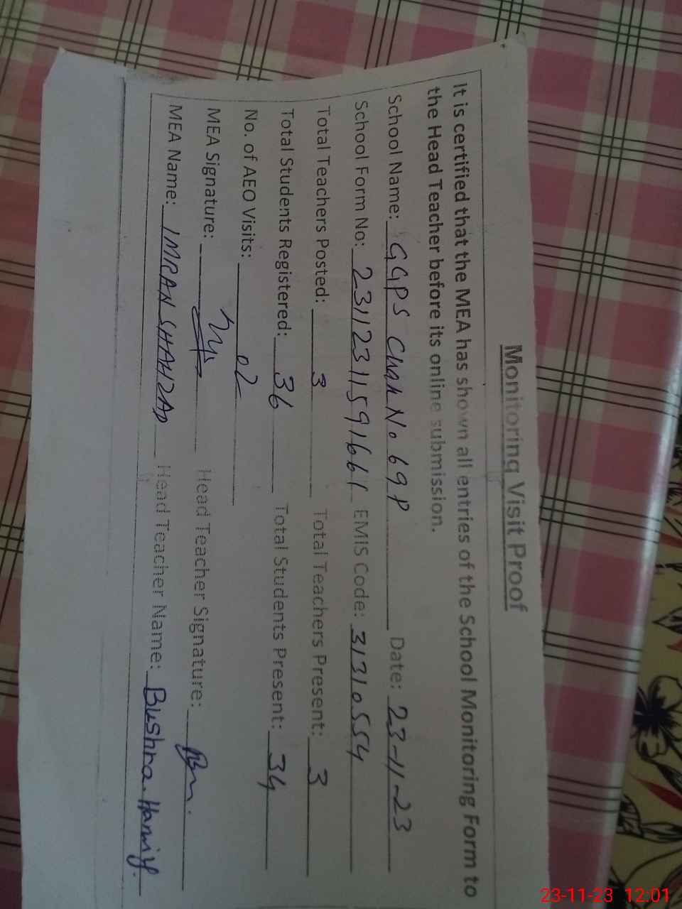 | Attendance Register | Head Teacher | MEA with School | Visit Proof |