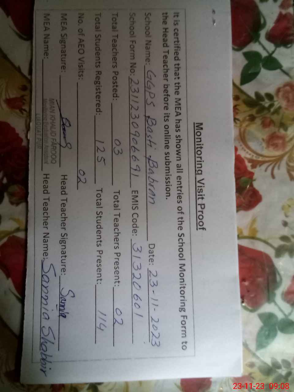 | Attendance Register | Head Teacher | MEA with School | Visit Proof |