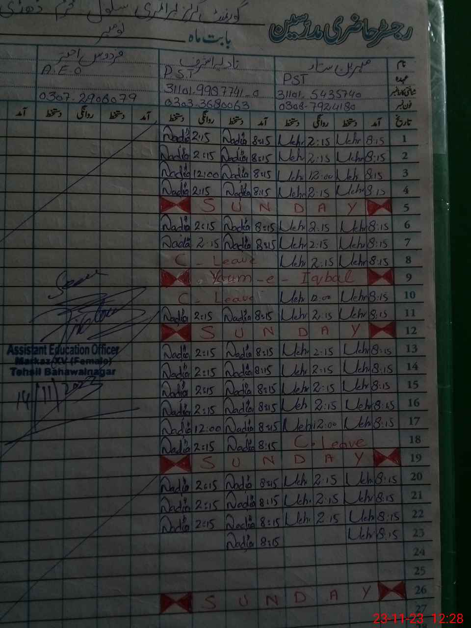 | CNIC | Full Name | Designation | R/C | Absence During Last Calender Month |