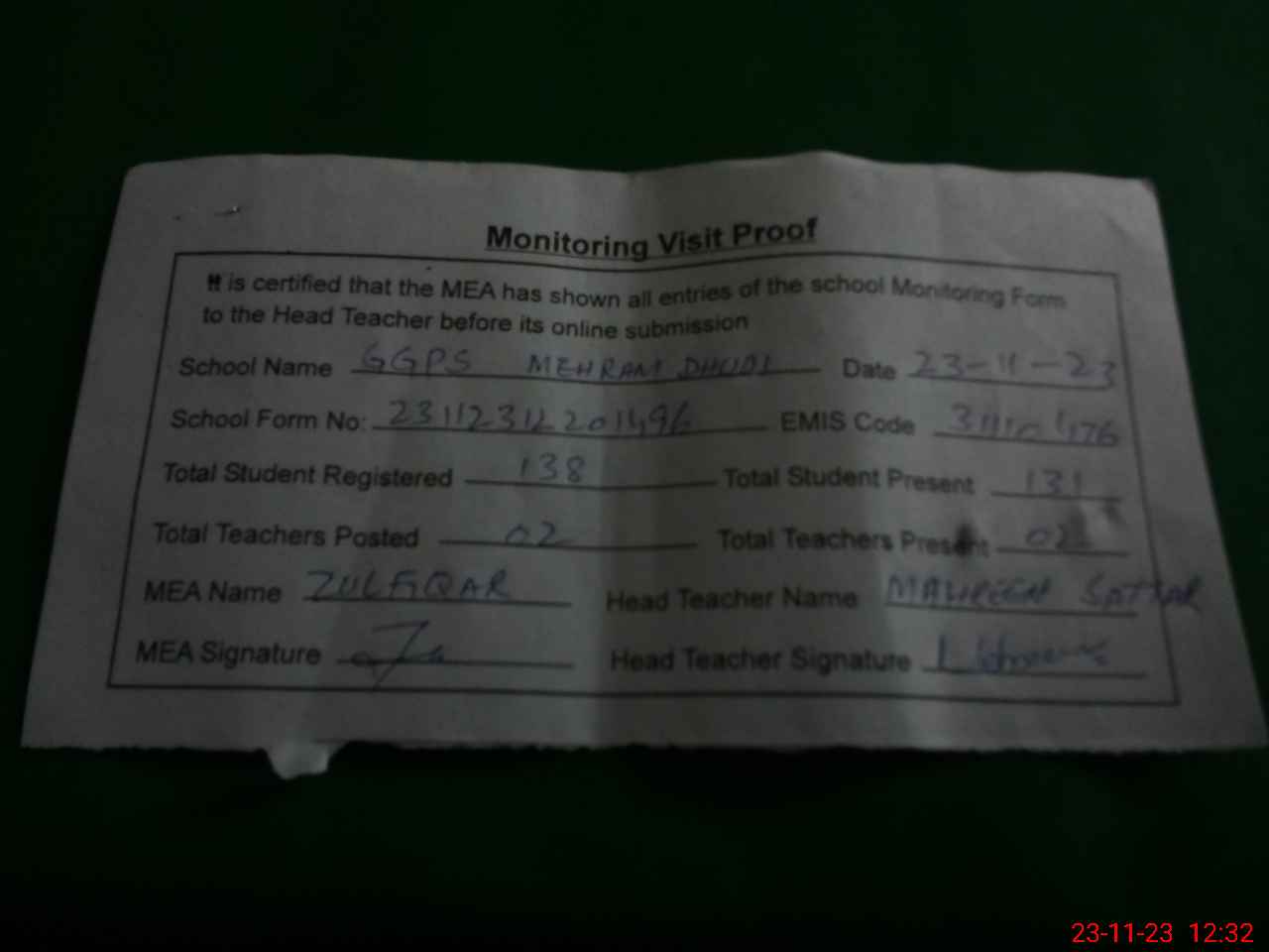 | Attendance Register | Head Teacher | MEA with School | Visit Proof |