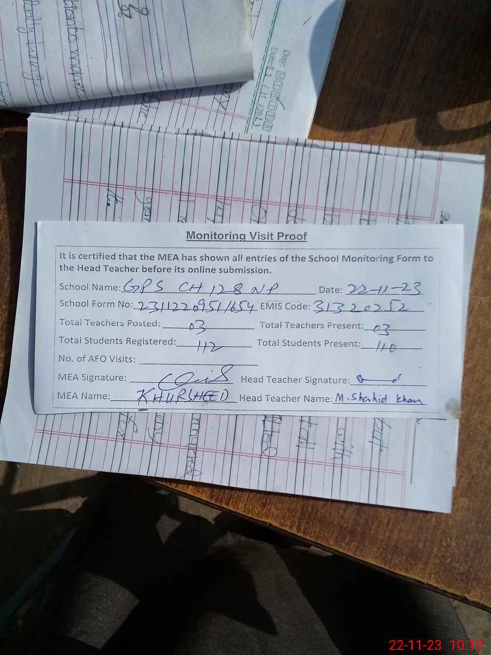 | Attendance Register | Head Teacher | MEA with School | Visit Proof |