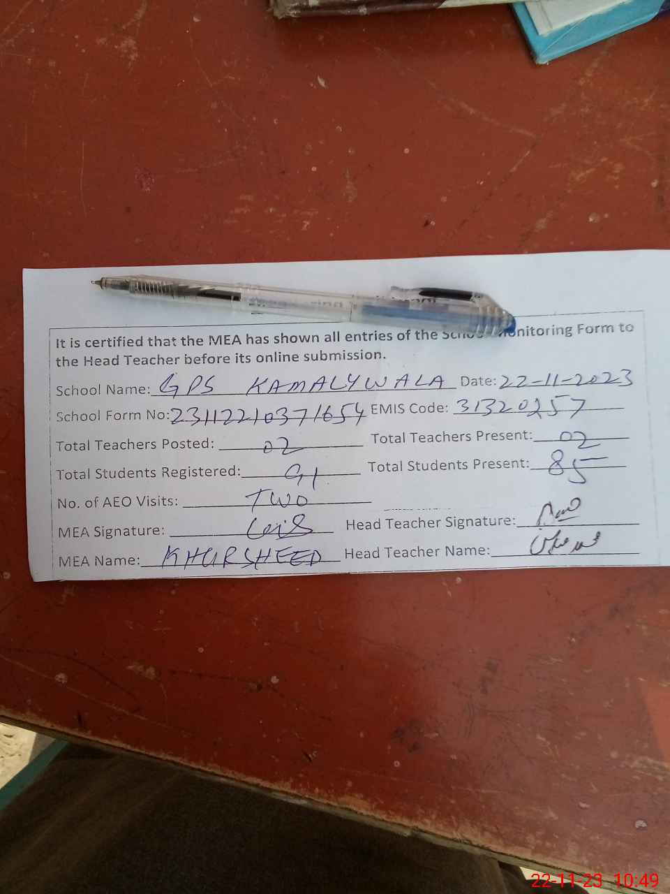 | Attendance Register | Head Teacher | MEA with School | Visit Proof |