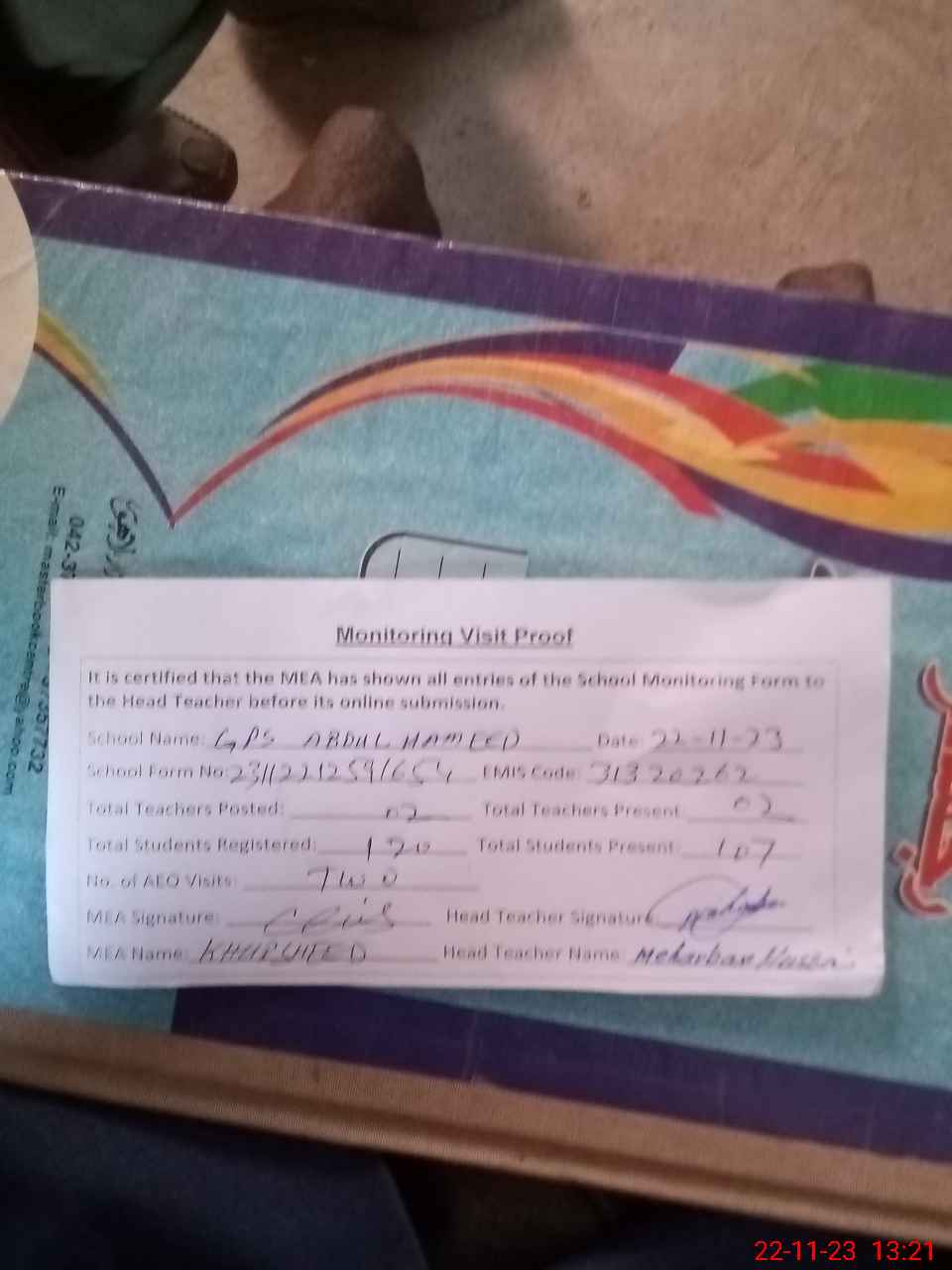 | EMIS Code: 31320262 | Name of School: GPS MALIK HAMEED | |||