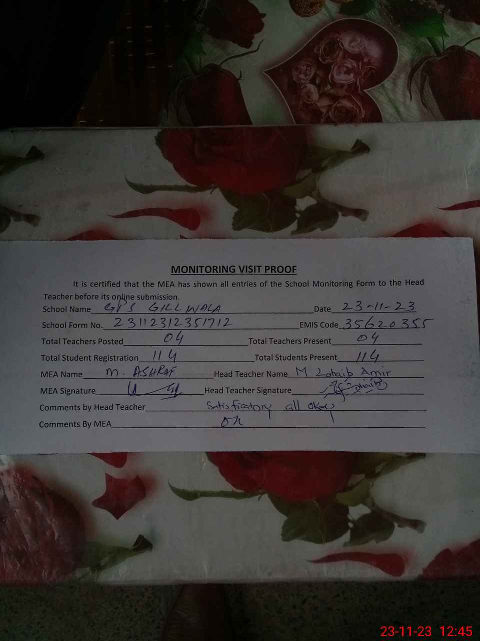 | Attendance Register | Head Teacher | MEA with School | Visit Proof |