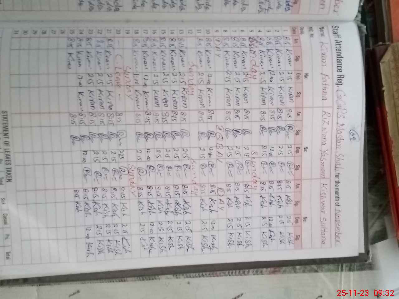 | CNIC | Full Name | Designation | R/C | Absence During Last Calender Month |