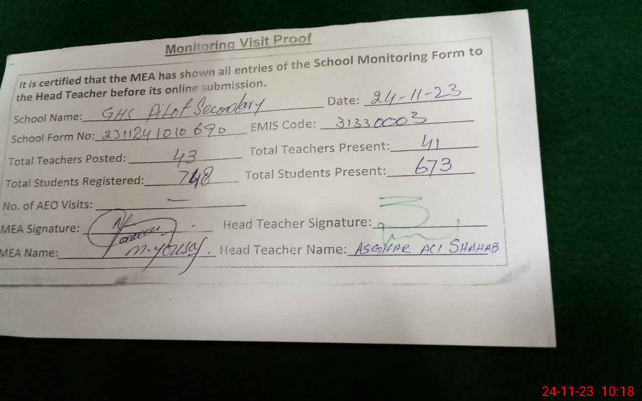 | Attendance Register | Head Teacher | MEA with School | Visit Proof |
