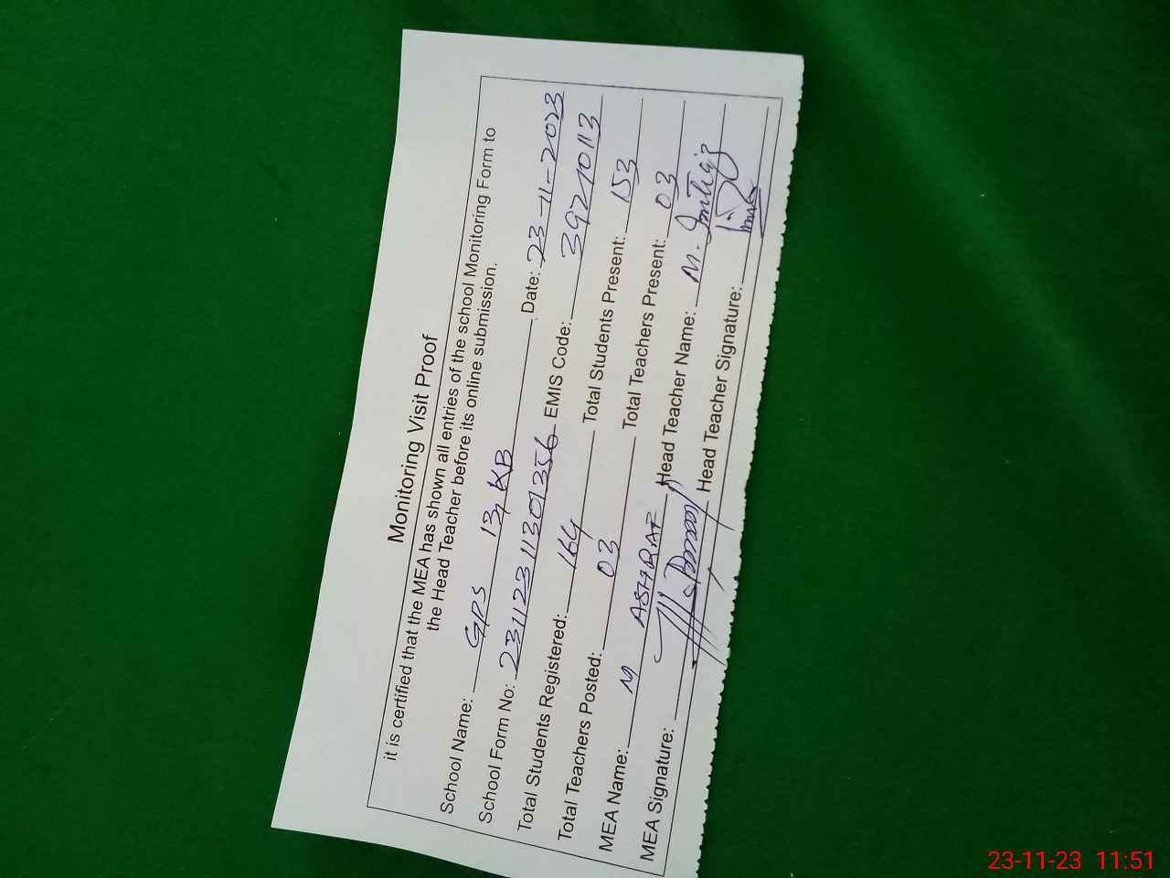 | Attendance Register | Head Teacher | MEA with School | Visit Proof |