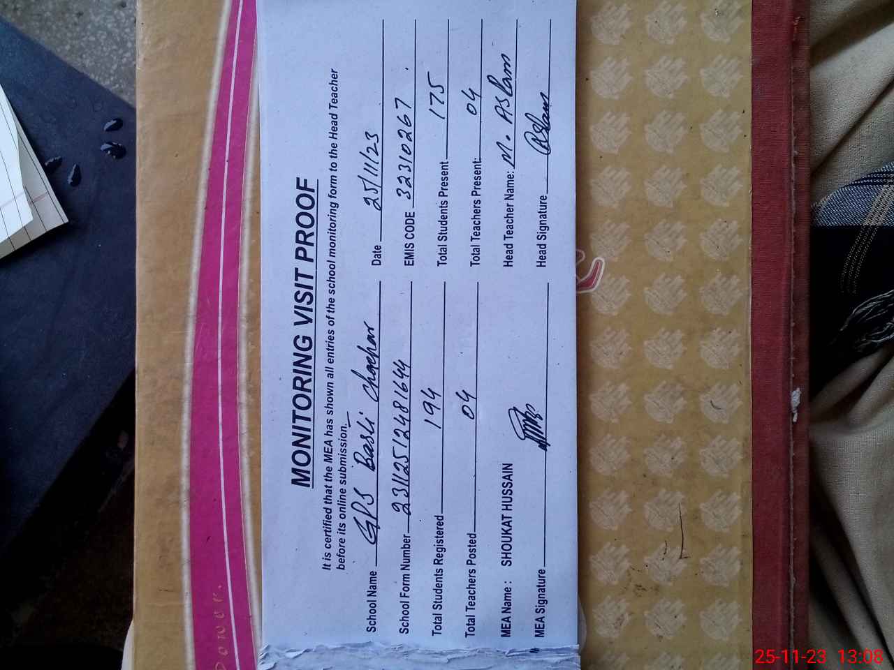 | Attendance Register | Head Teacher | MEA with School | Visit Proof |