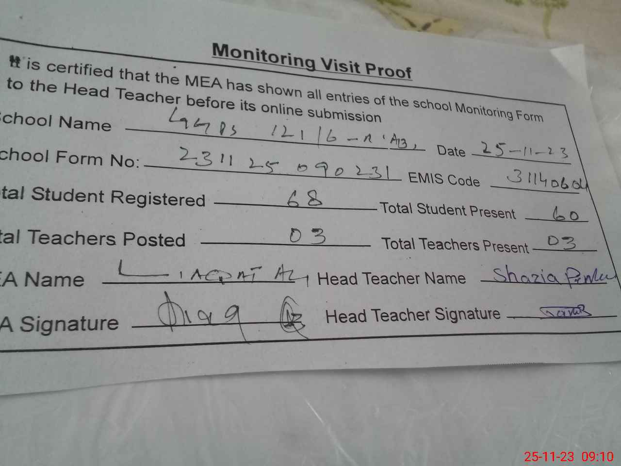 | EMIS Code: 31140604 | Name of School: GGPS CHAK NO.121/6-R AB | |||