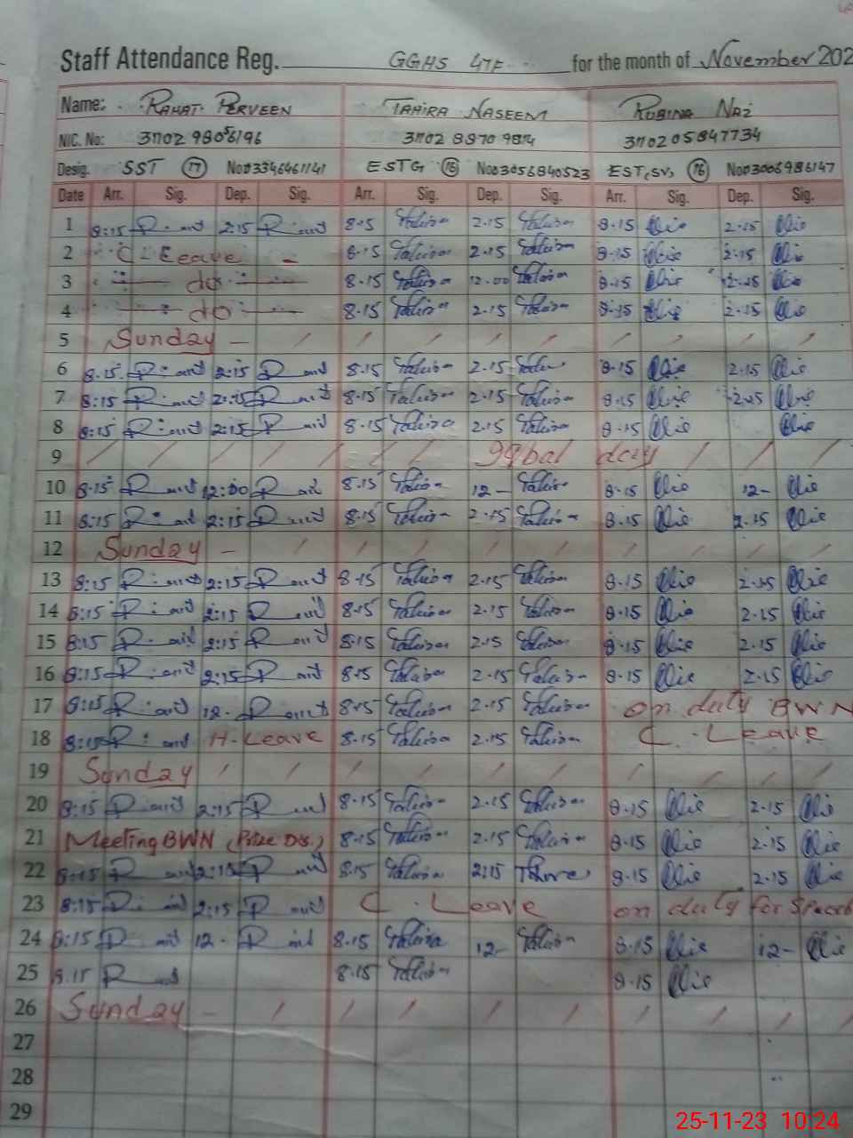 | CNIC | Full Name | Designation | R/C | Absence During Last Calender Month |