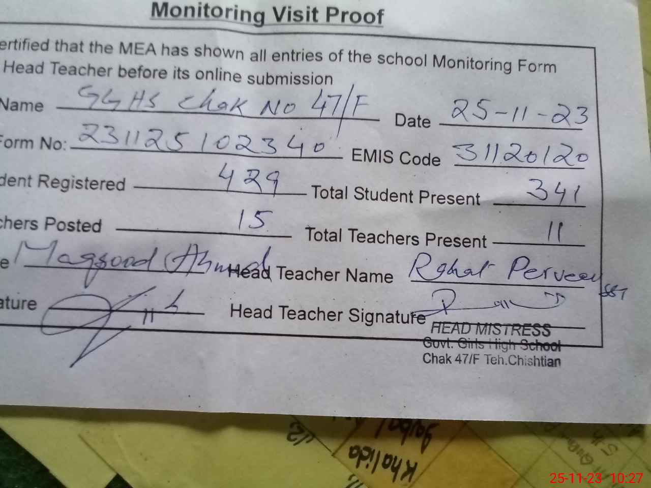 | Attendance Register | Head Teacher | MEA with School | Visit Proof |