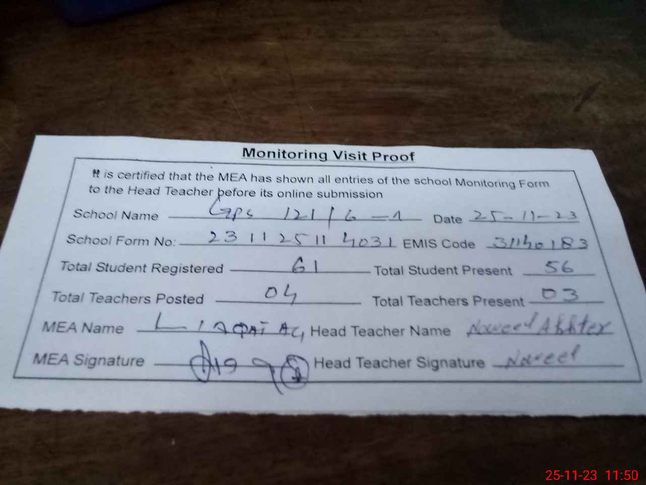 | Attendance Register | Head Teacher | MEA with School | Visit Proof |