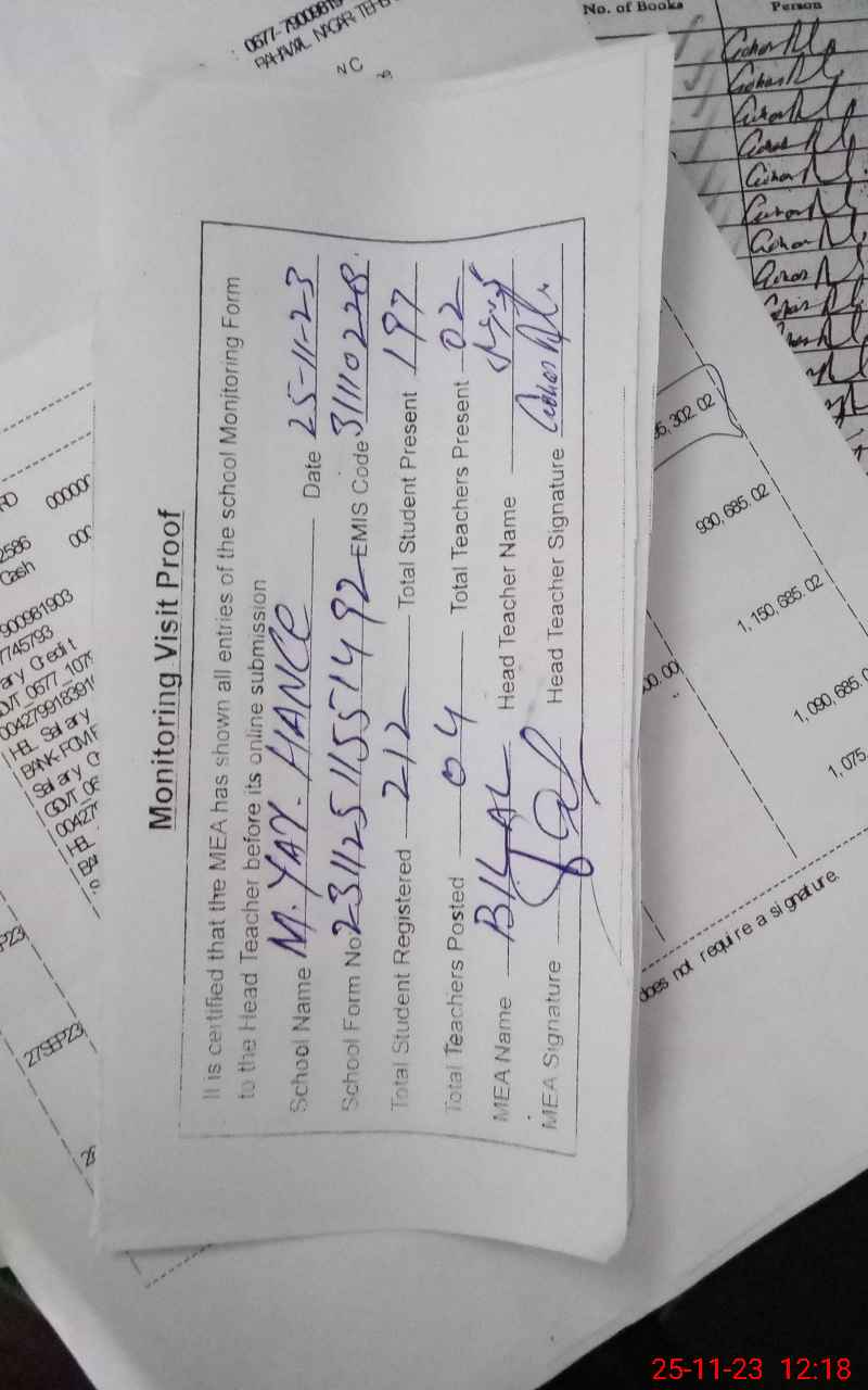 | Attendance Register | Head Teacher | MEA with School | Visit Proof |