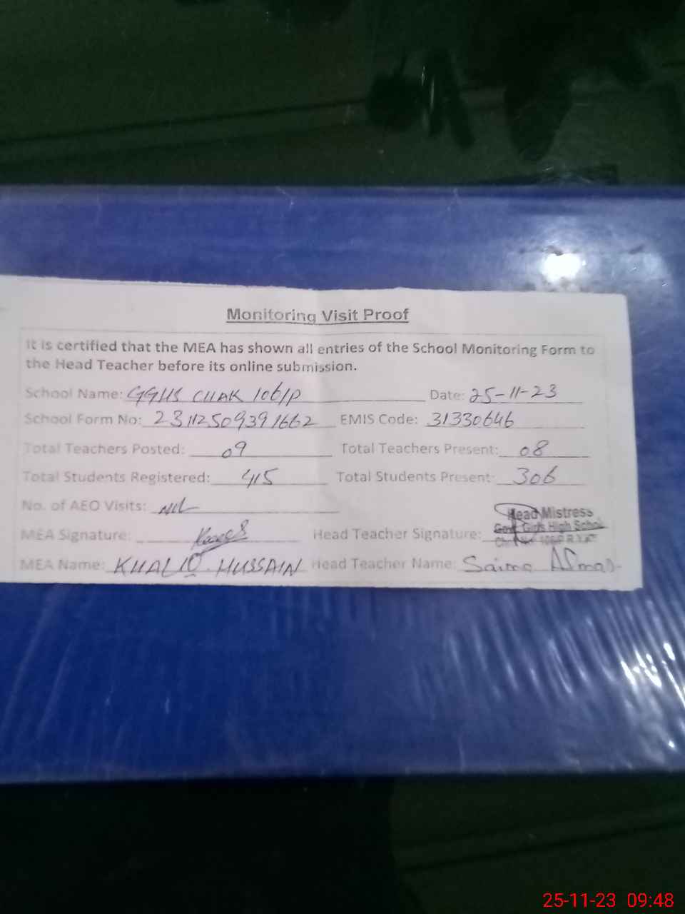 | EMIS Code: 31330646 | Name of School: GGHS 106/P R.Y.KHAN | |||