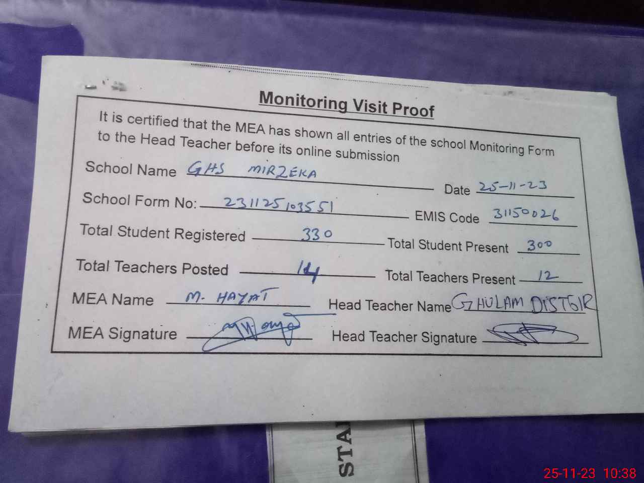 | Attendance Register | Head Teacher | MEA with School | Visit Proof |