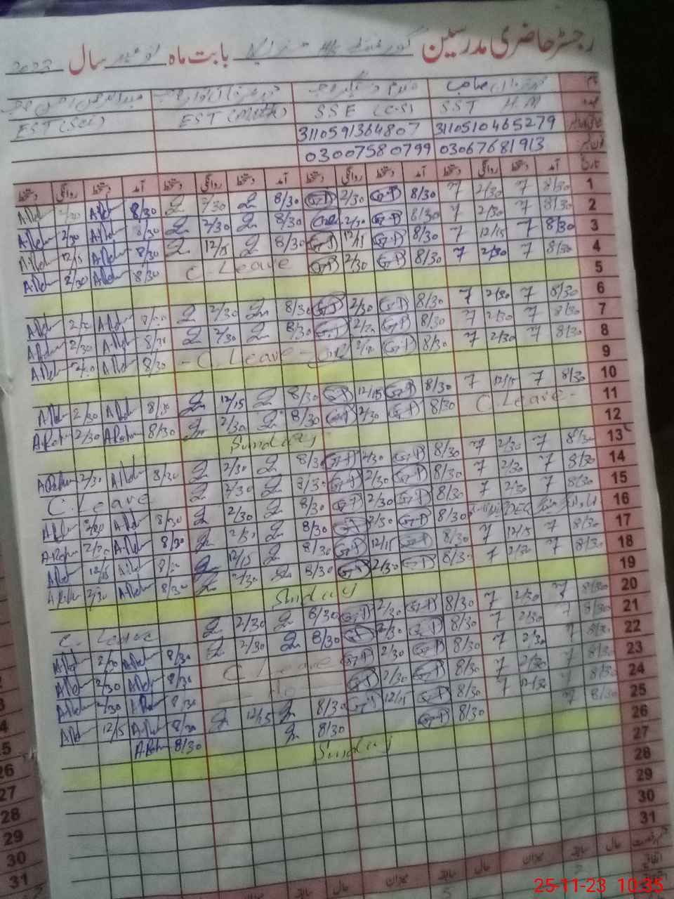 | CNIC | Full Name | Designation | R/C | Absence During Last Calender Month |