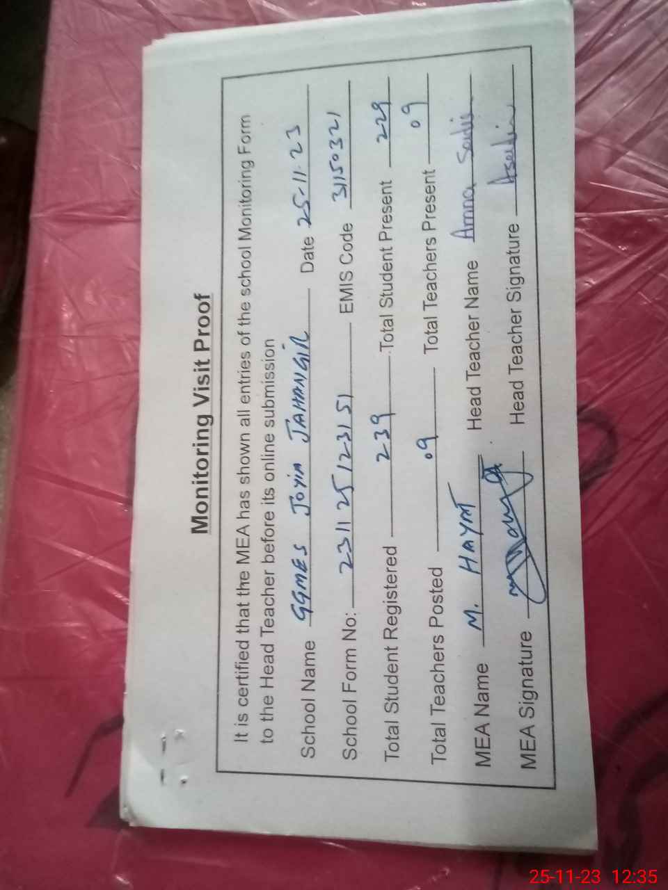 | Attendance Register | Head Teacher | MEA with School | Visit Proof |