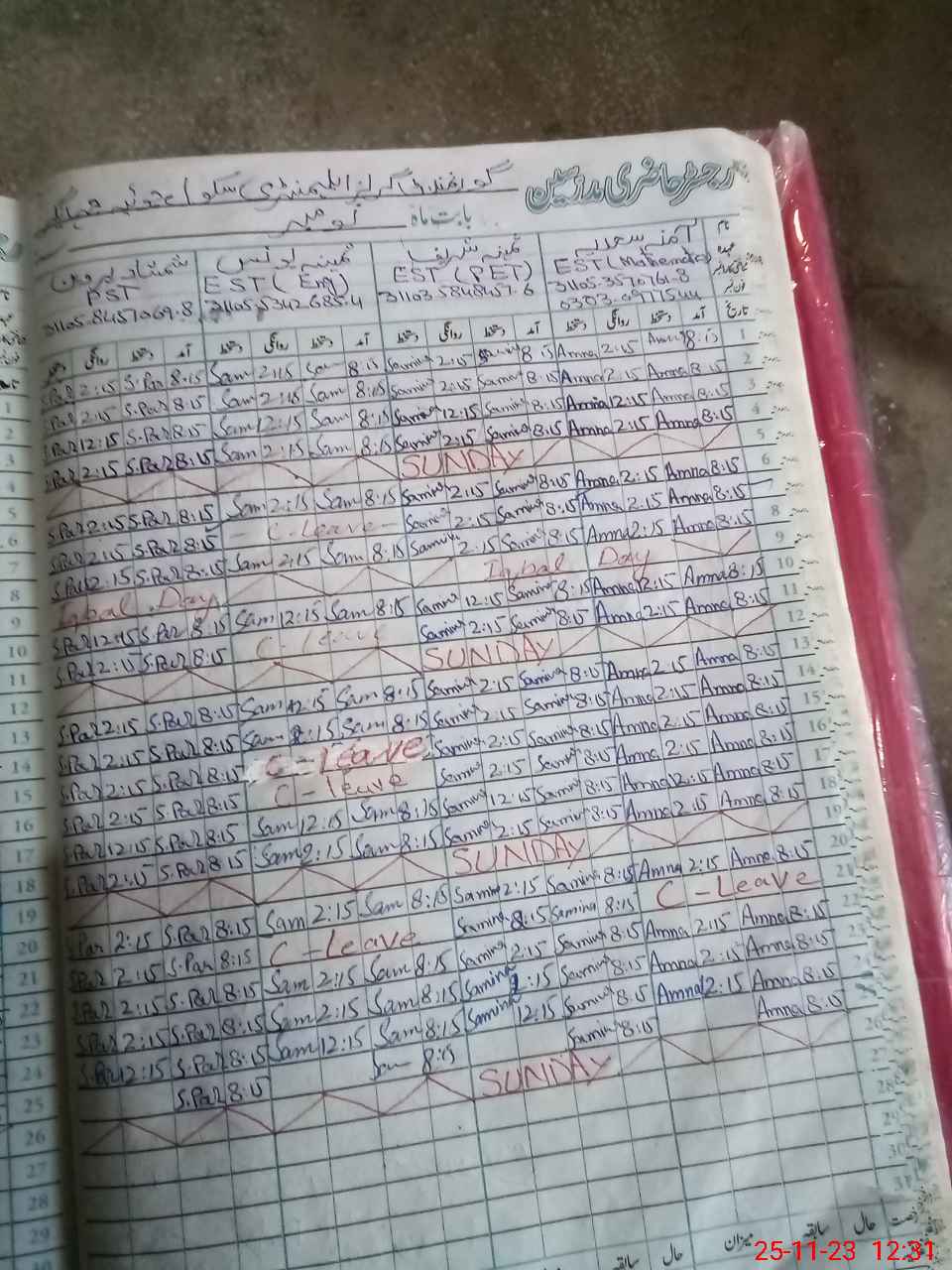 | CNIC | Full Name | Designation | R/C | Absence During Last Calender Month |