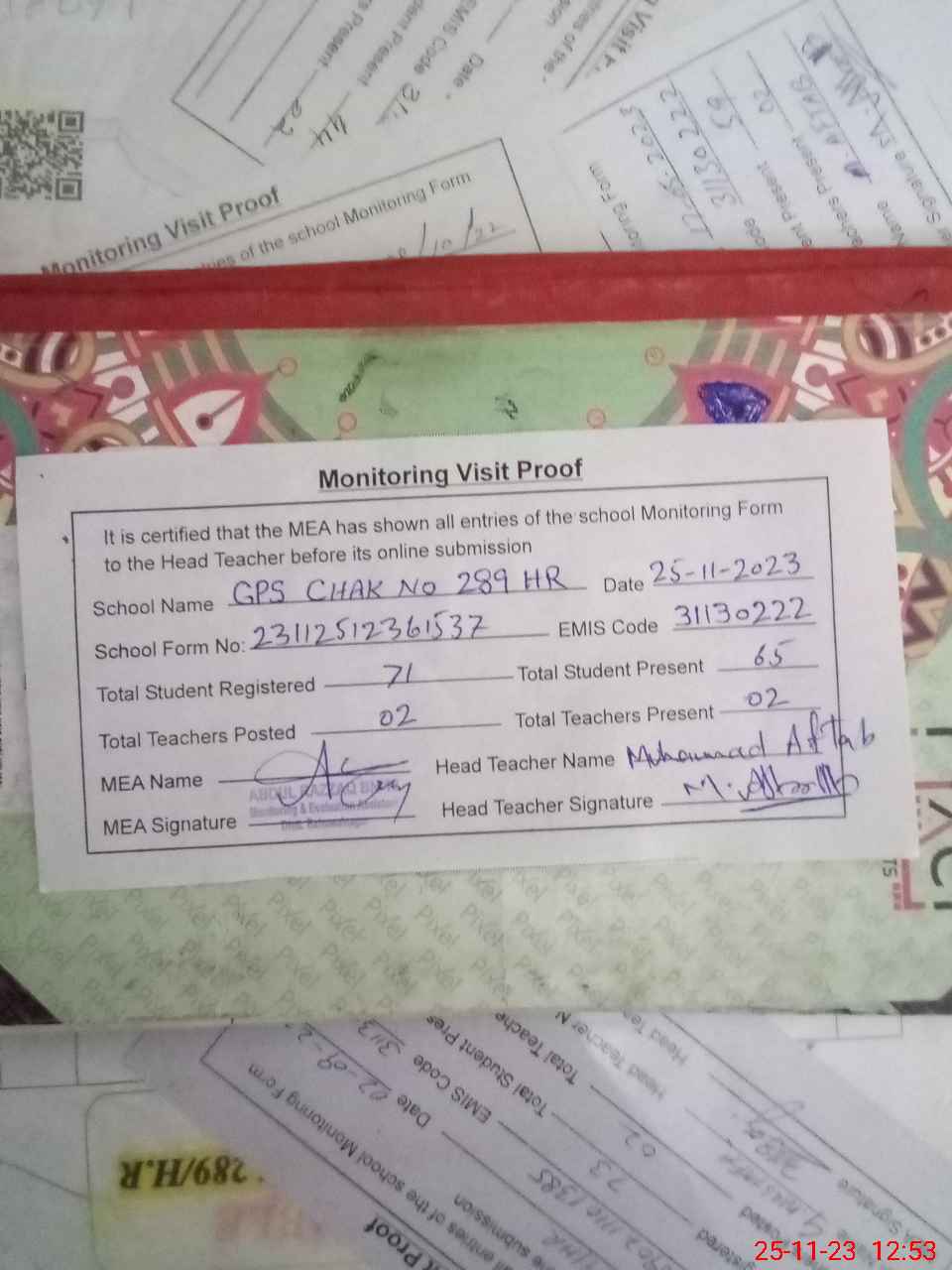 | EMIS Code: 31130222 | Name of School: GPS CHAK NO 289 HR | |||