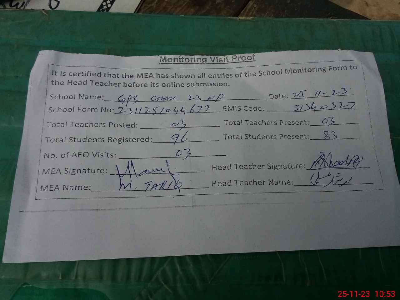 | EMIS Code: 31340327 | Name of School: GPS CHAK NO 23/NP | |||