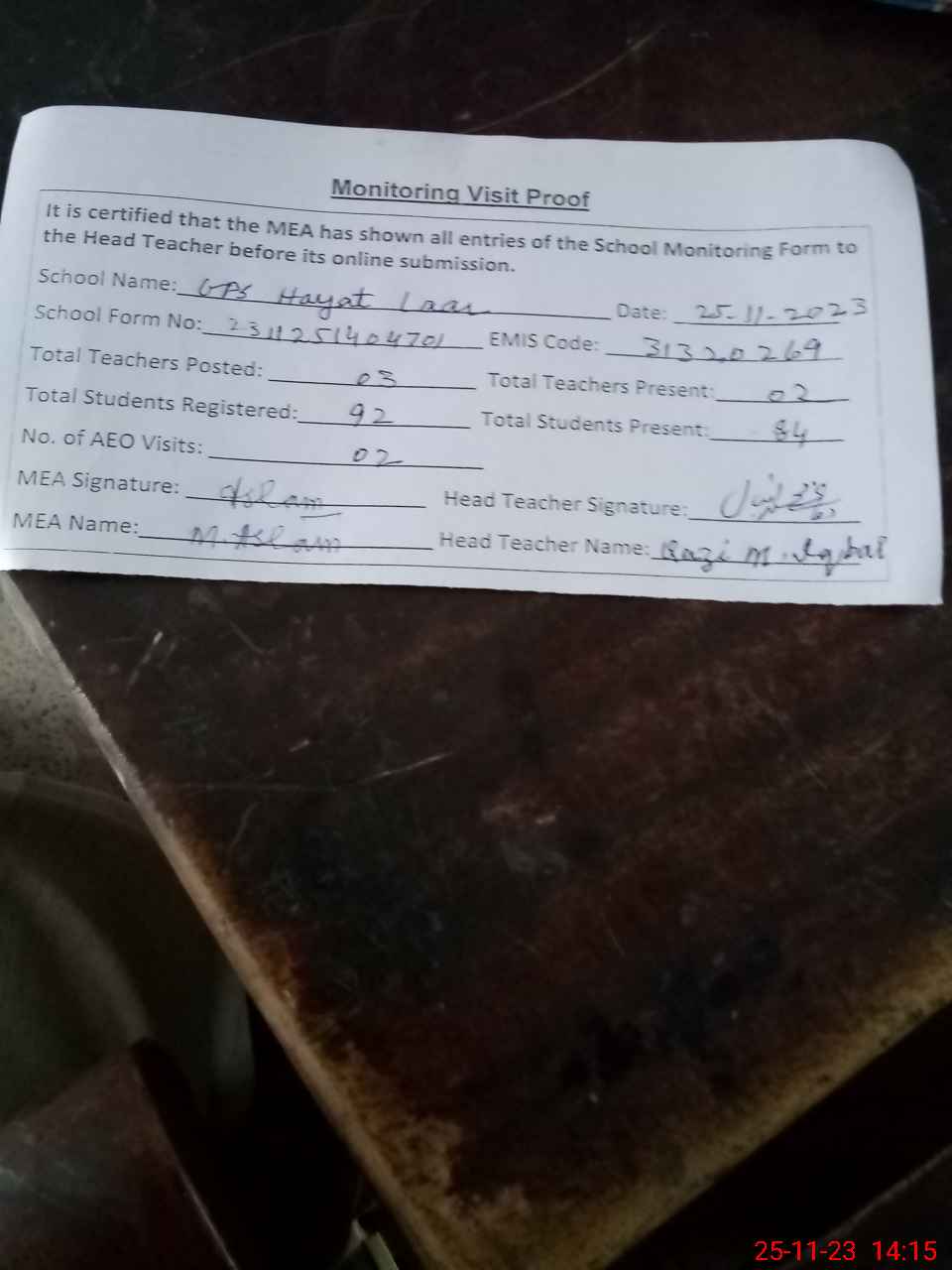 | Attendance Register | Head Teacher | MEA with School | Visit Proof |