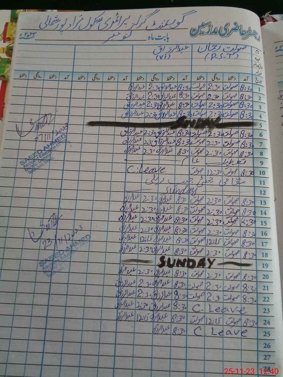 | CNIC | Full Name | Designation | R/C | Absence During Last Calender Month |