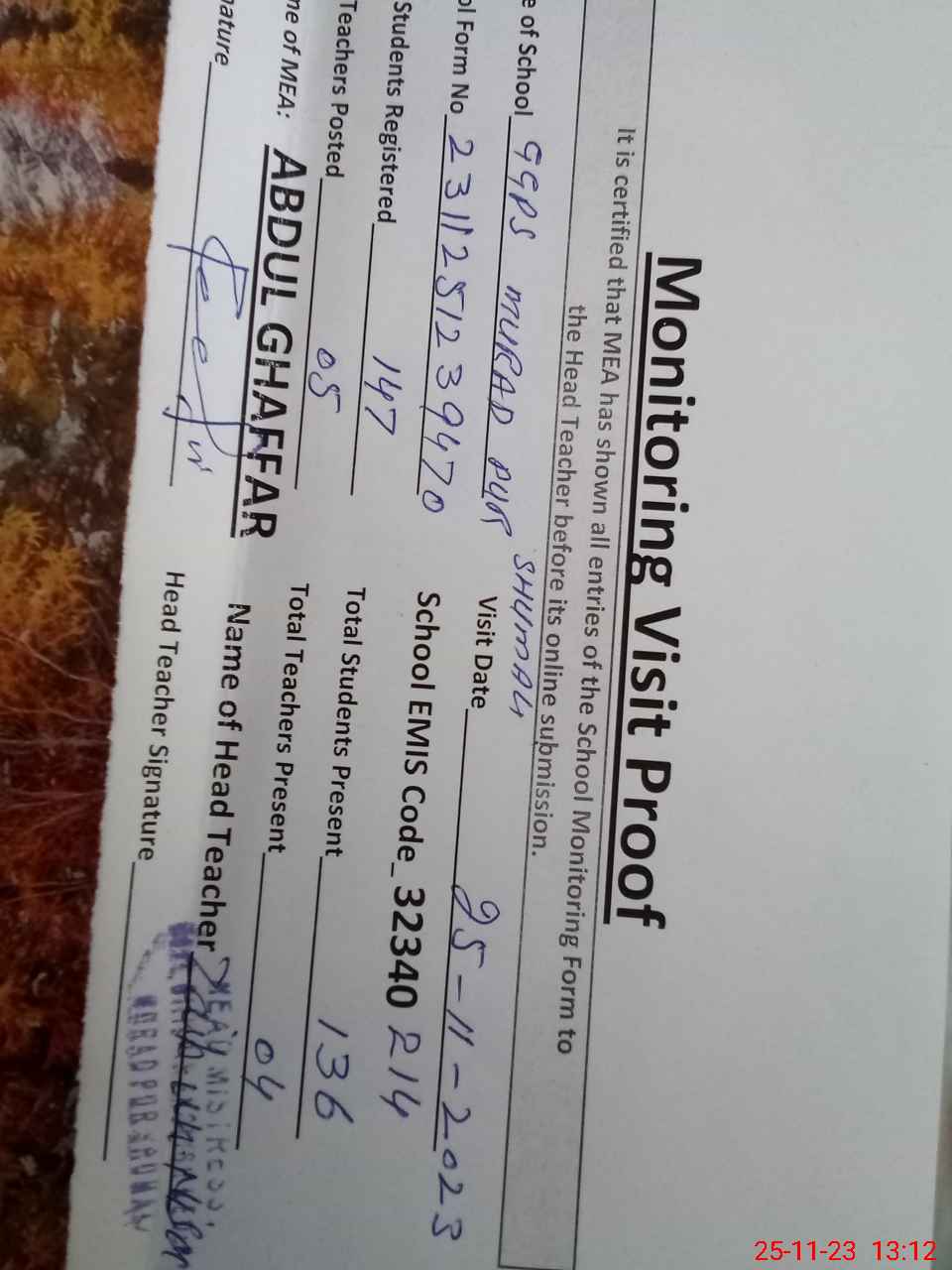 | Attendance Register | Head Teacher | MEA with School | Visit Proof |