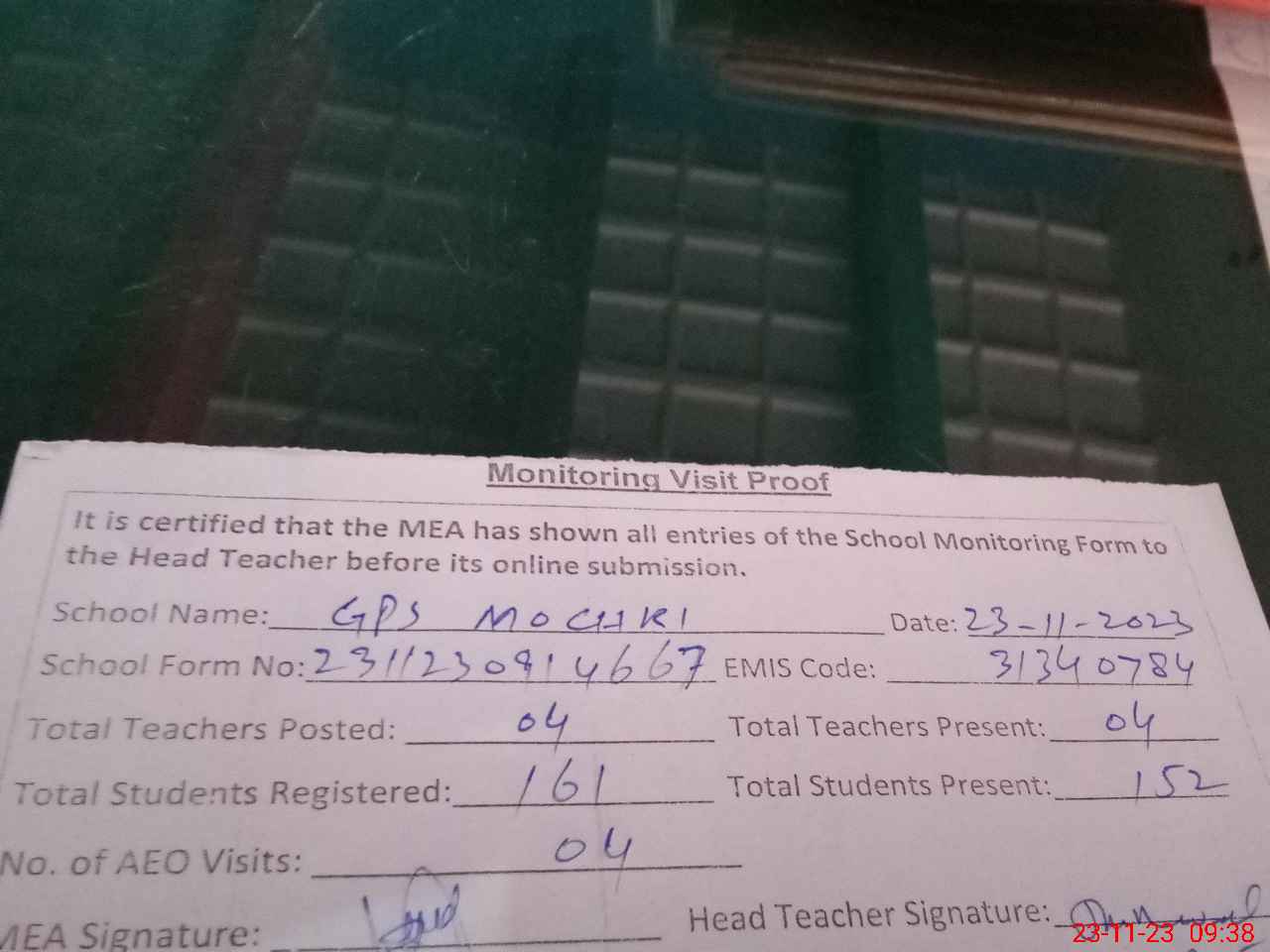 | Attendance Register | Head Teacher | MEA with School | Visit Proof |