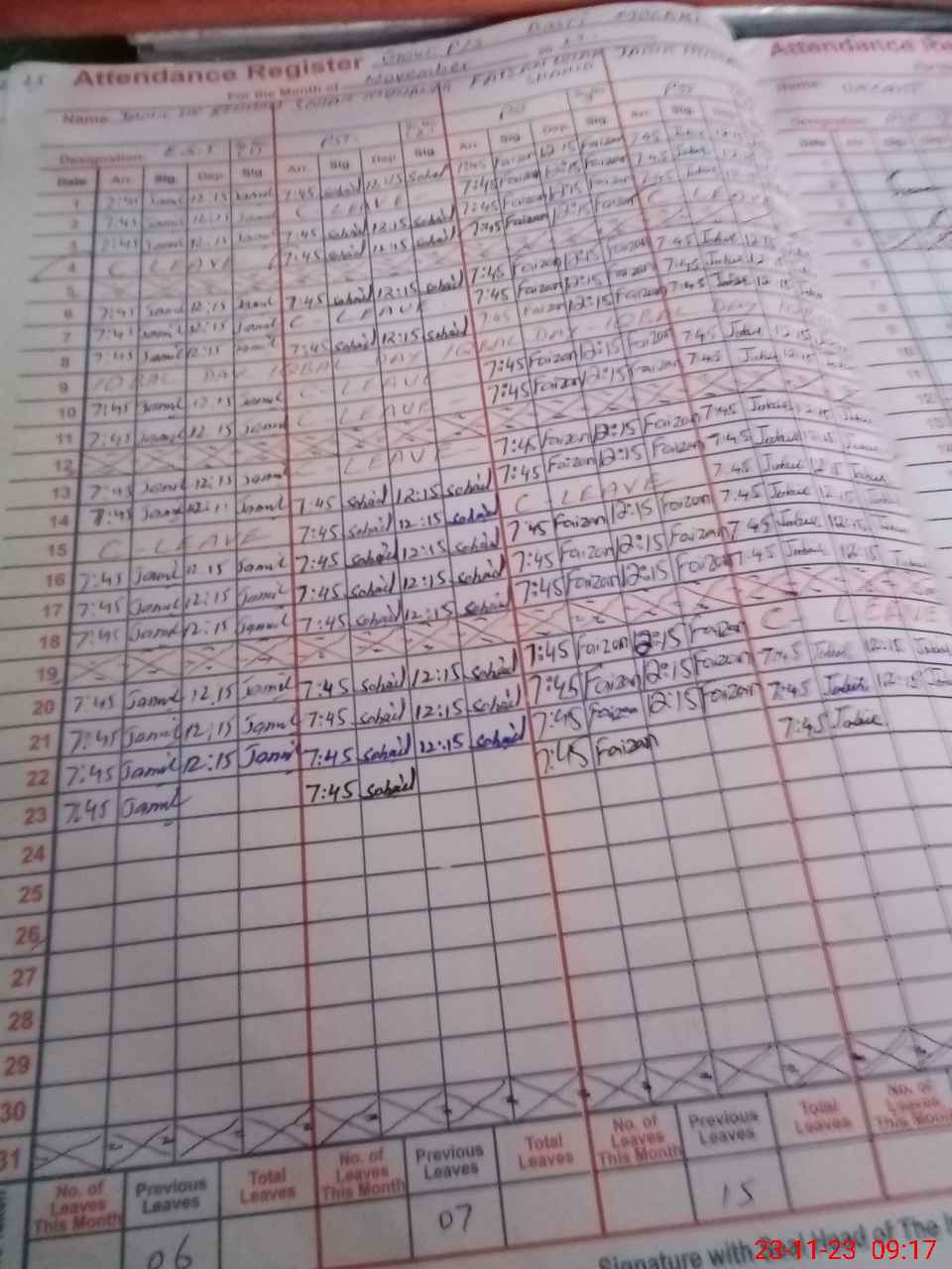 | CNIC | Full Name | Designation | R/C | Absence During Last Calender Month |