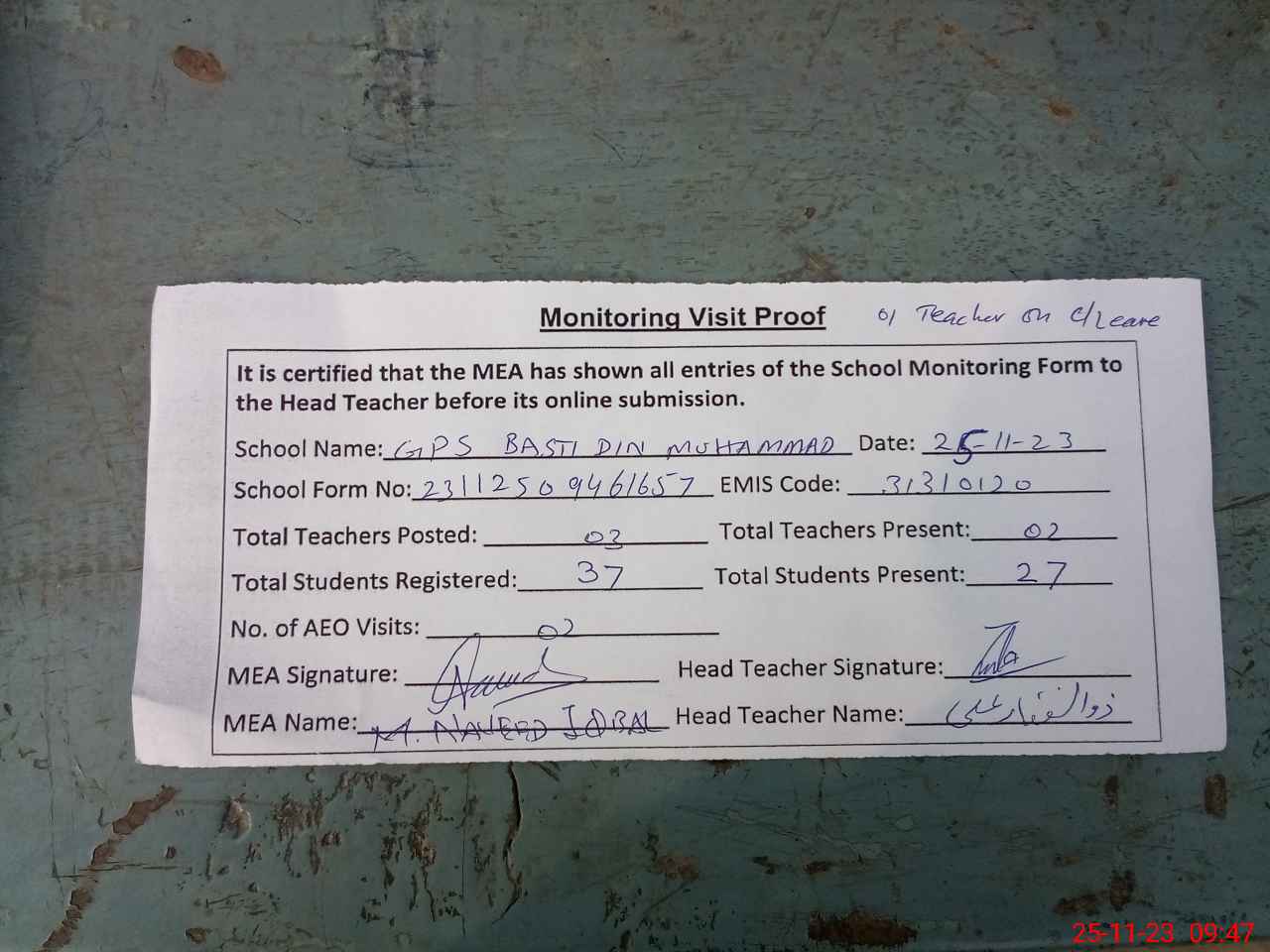 | Attendance Register | Head Teacher | MEA with School | Visit Proof |