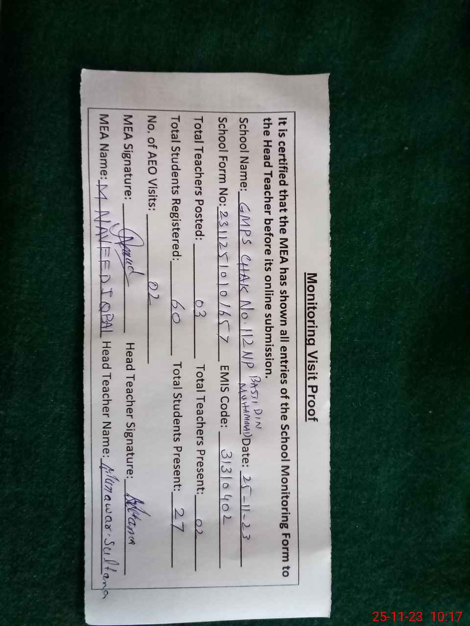 | Attendance Register | Head Teacher | MEA with School | Visit Proof |