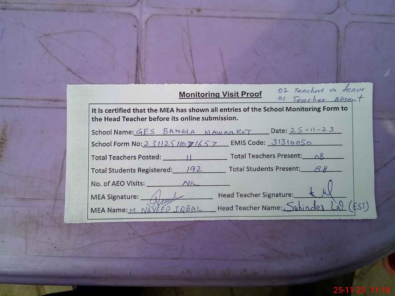 | Attendance Register | Head Teacher | MEA with School | Visit Proof |