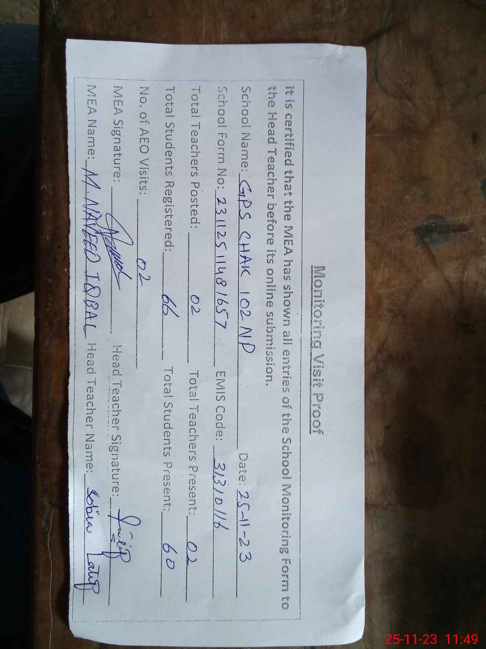 | Attendance Register | Head Teacher | MEA with School | Visit Proof |