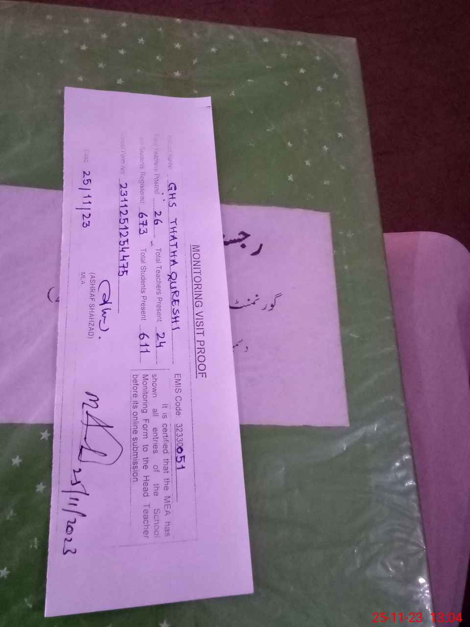 | Monitoring Date: 25-11-2023 | Start Time: 25-11-2023 11:24 AM | End Time: 25-11-2023 01:11 PM | Name of MEA: Mu**** As**** Sh**** | |
