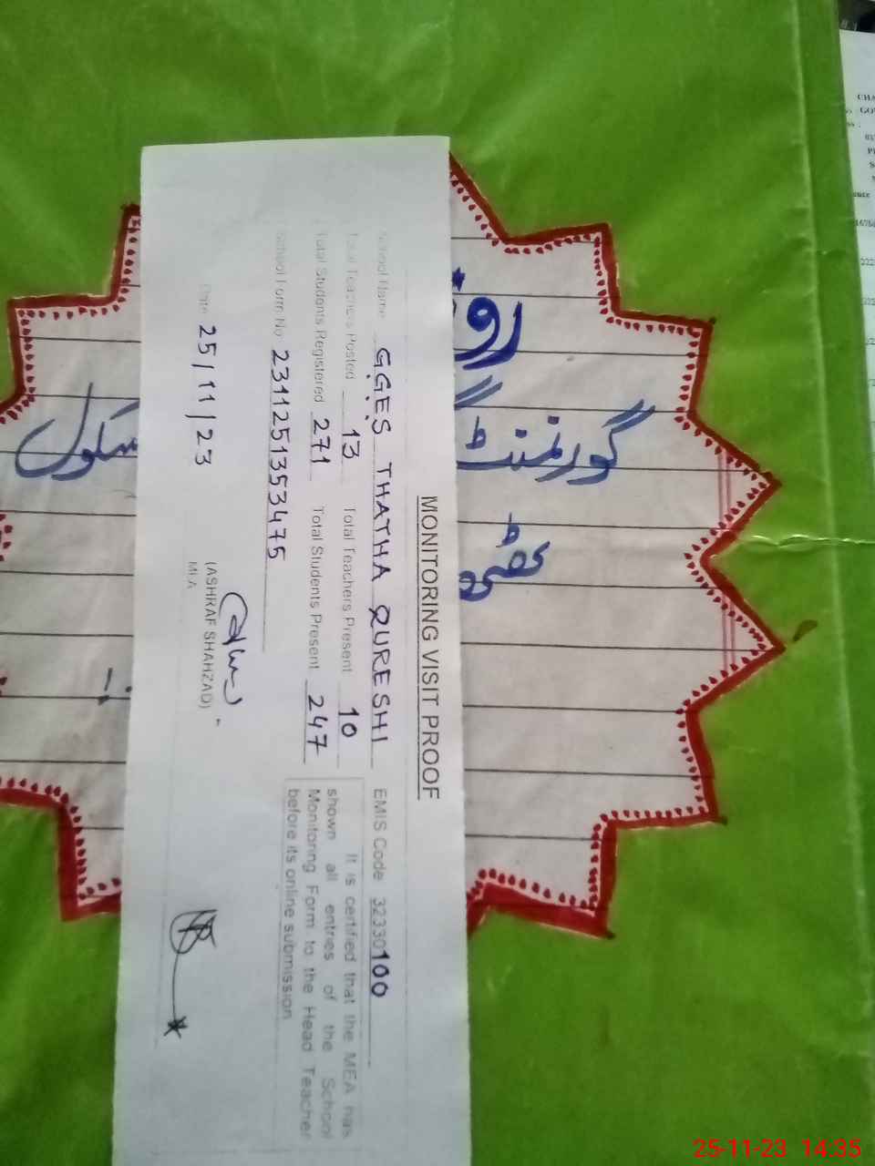 | EMIS Code: 32330100 | Name of School: GGES THATHA QURESHI | |||