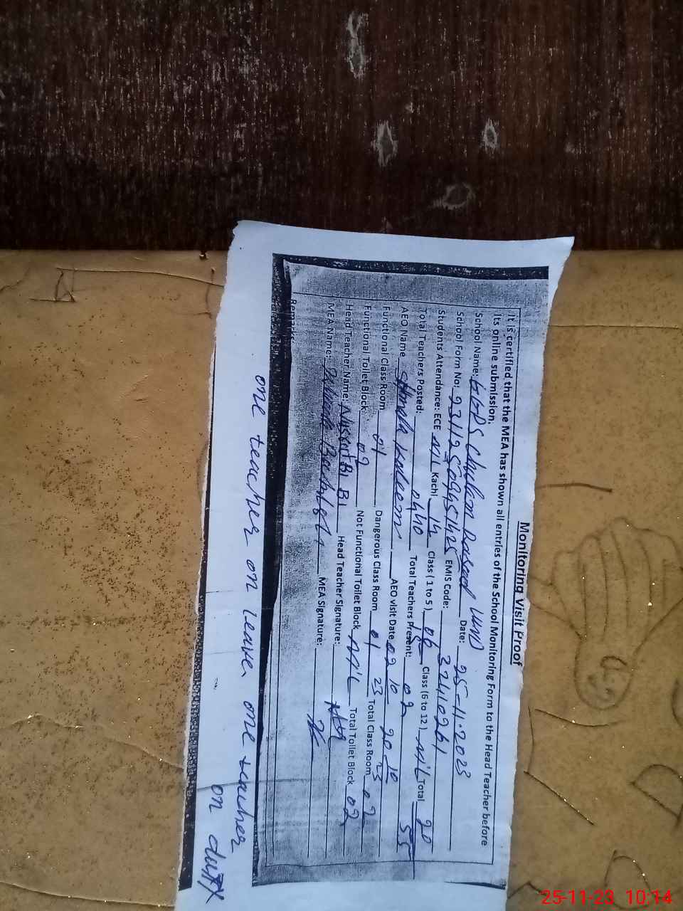 | Attendance Register | Head Teacher | MEA with School | Visit Proof |