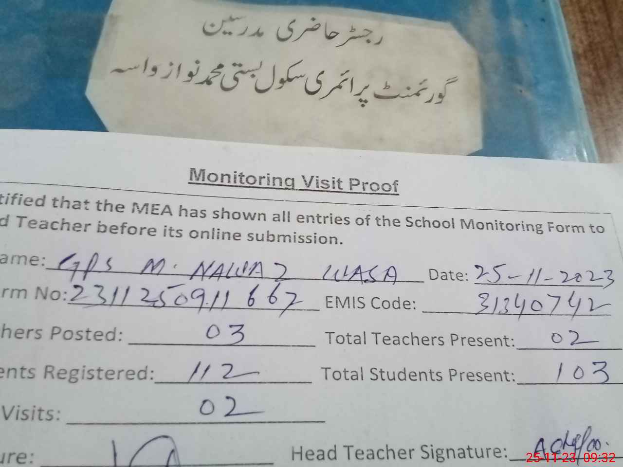 | Attendance Register | Head Teacher | MEA with School | Visit Proof |