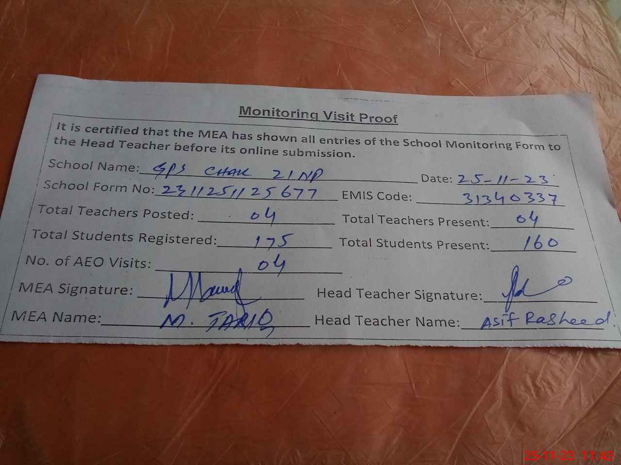 | EMIS Code: 31340337 | Name of School: GPS CHAK NO 21/NP | |||