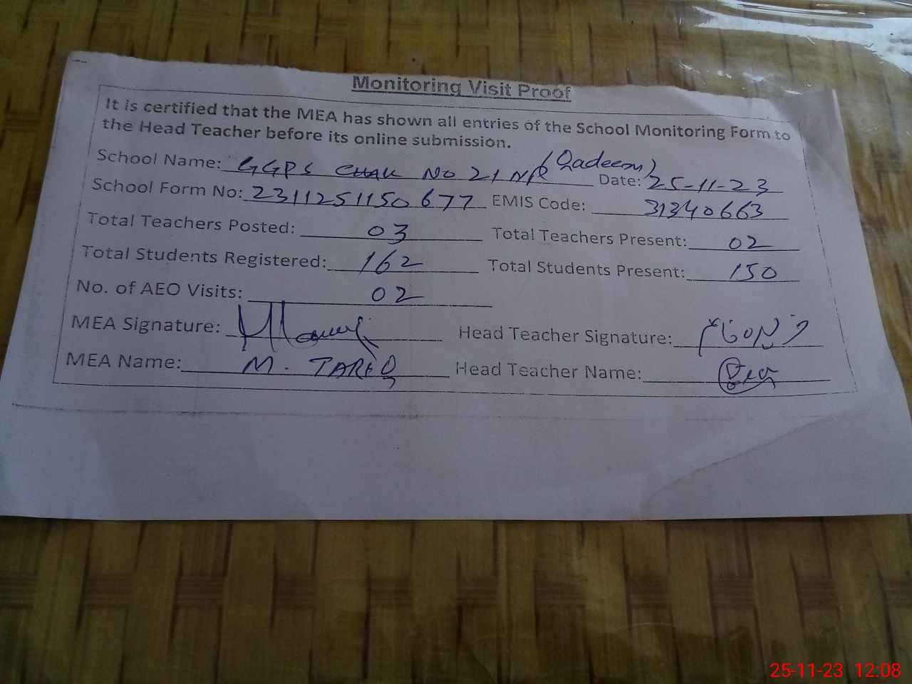 | Attendance Register | Head Teacher | MEA with School | Visit Proof |