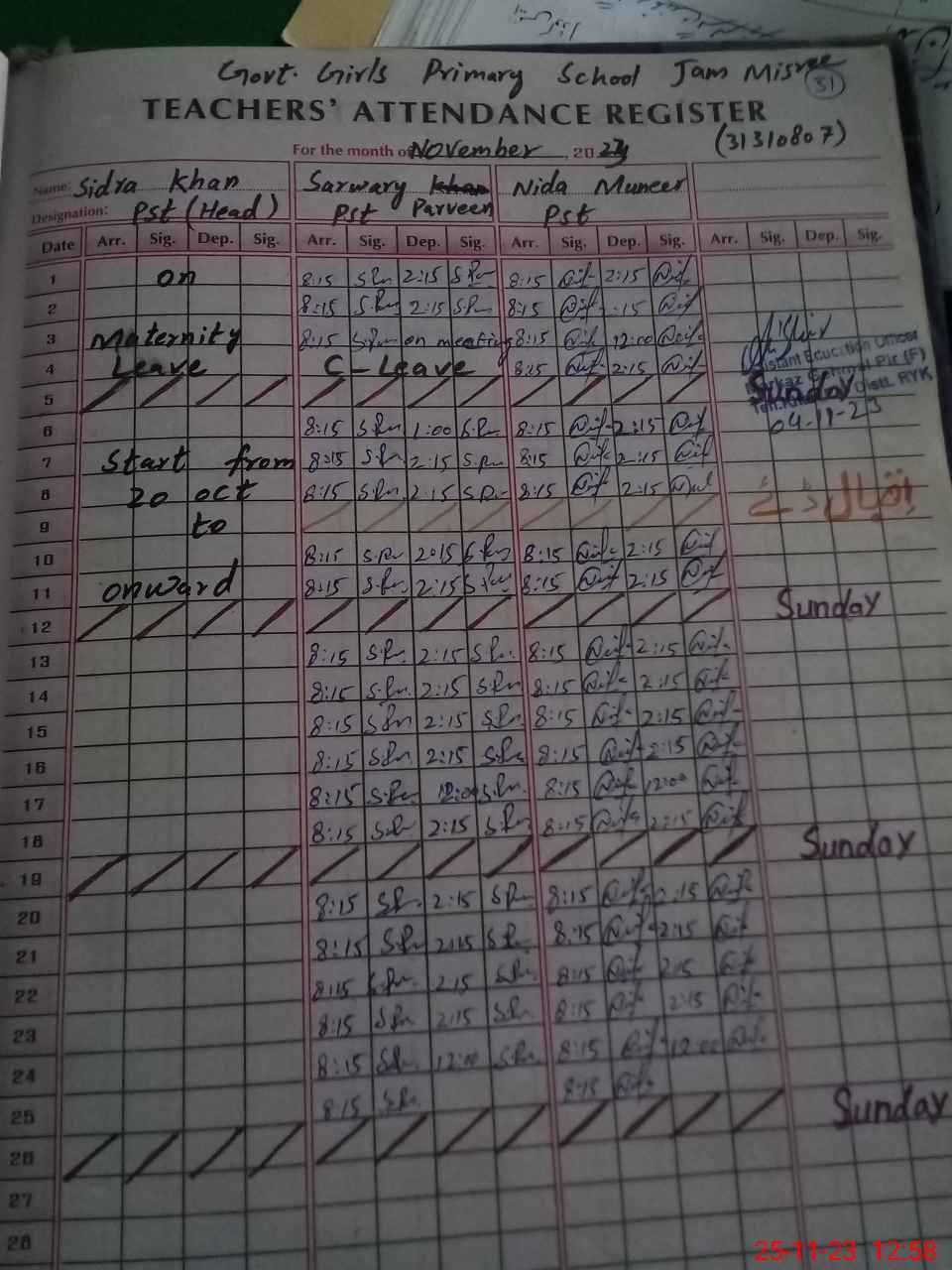 | Name: Si**** Kh**** Designation: (School Headmaster's/Headmistress's) PST Phone/Cell Number: 03**** |