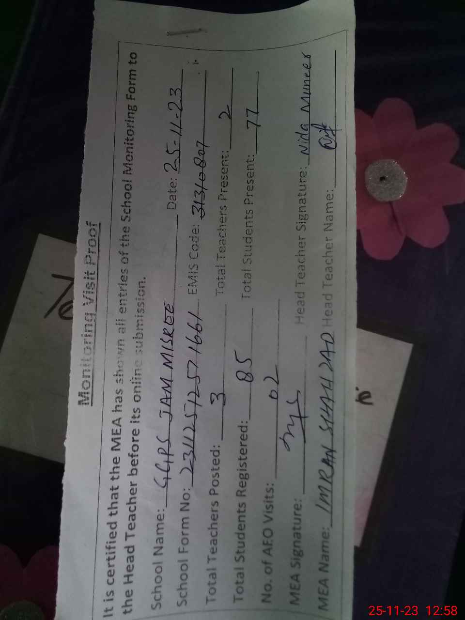 | Attendance Register | Head Teacher | MEA with School | Visit Proof |