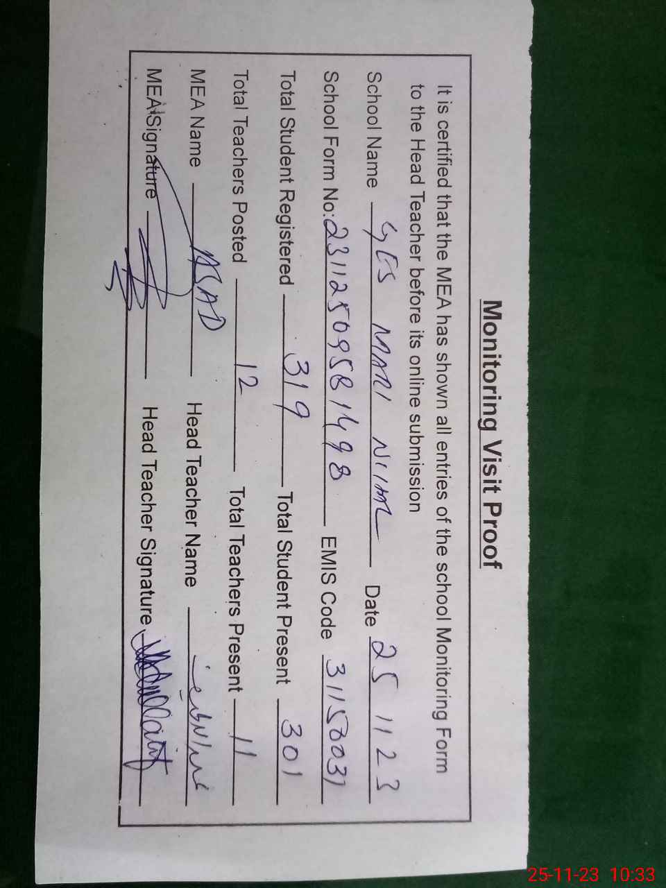 | Attendance Register | Head Teacher | MEA with School | Visit Proof |
