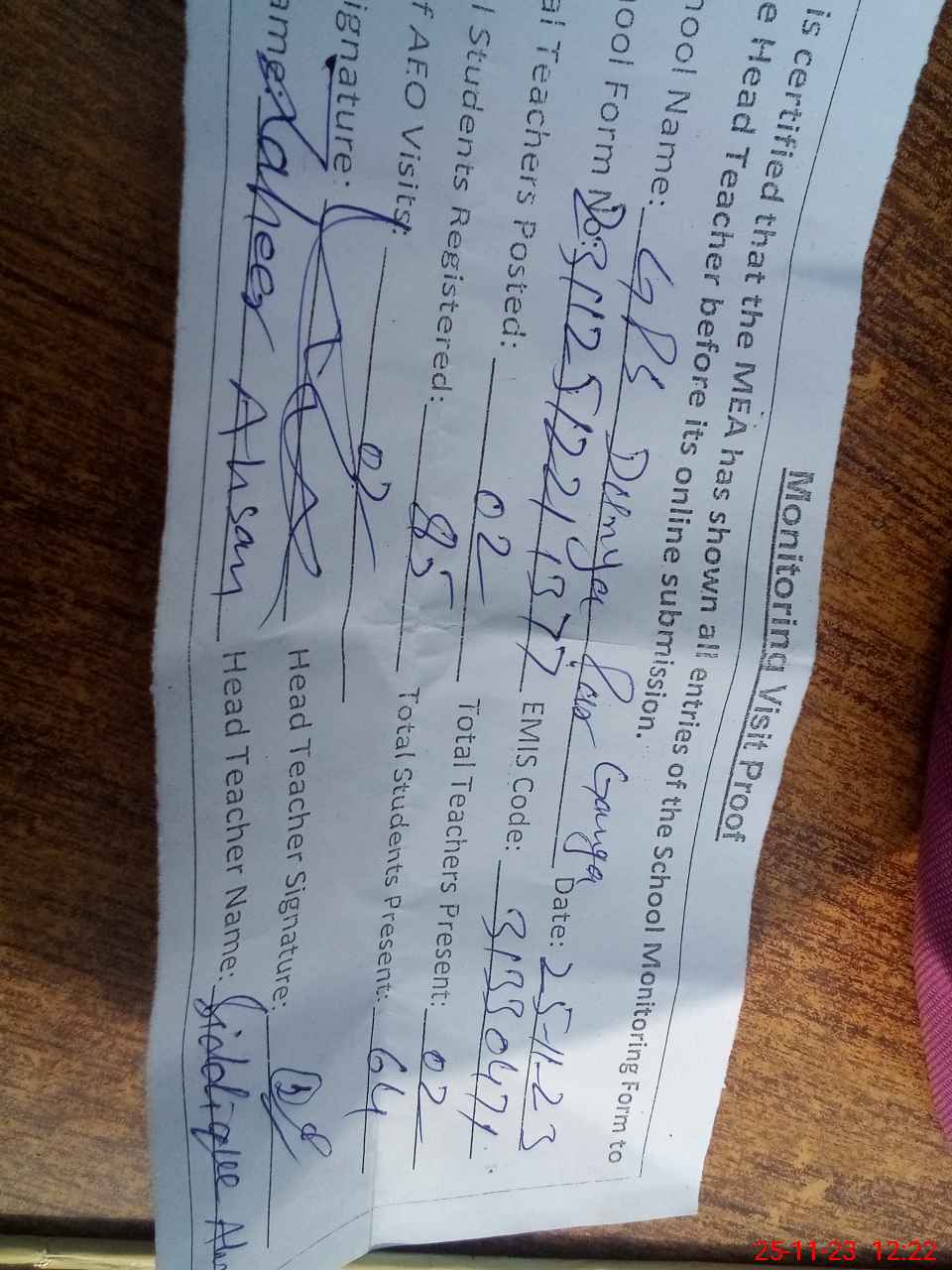 | EMIS Code: 31330471 | Name of School: GPS DUNYA PUR GANGA | |||