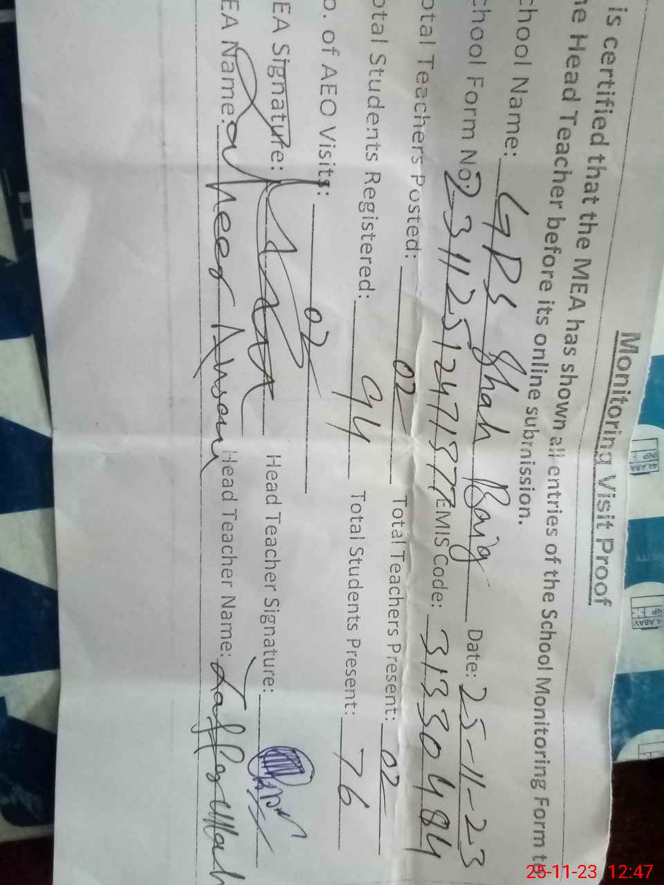 | EMIS Code: 31330484 | Name of School: GPS SHAH BAIG | |||