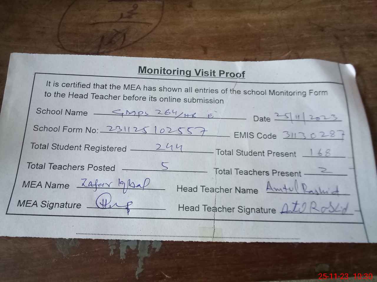 | EMIS Code: 31130287 | Name of School: GGPS CHAK NO. 264 HR W | |||