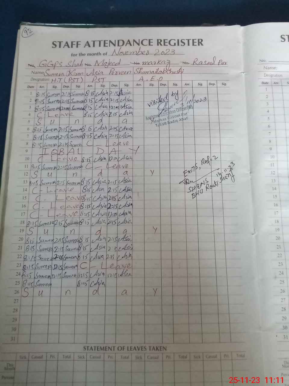 | Monitoring Date: 25-11-2023 | Start Time: 25-11-2023 10:52 AM | End Time: 25-11-2023 11:11 AM | Name of MEA: Mu**** Ak**** | |